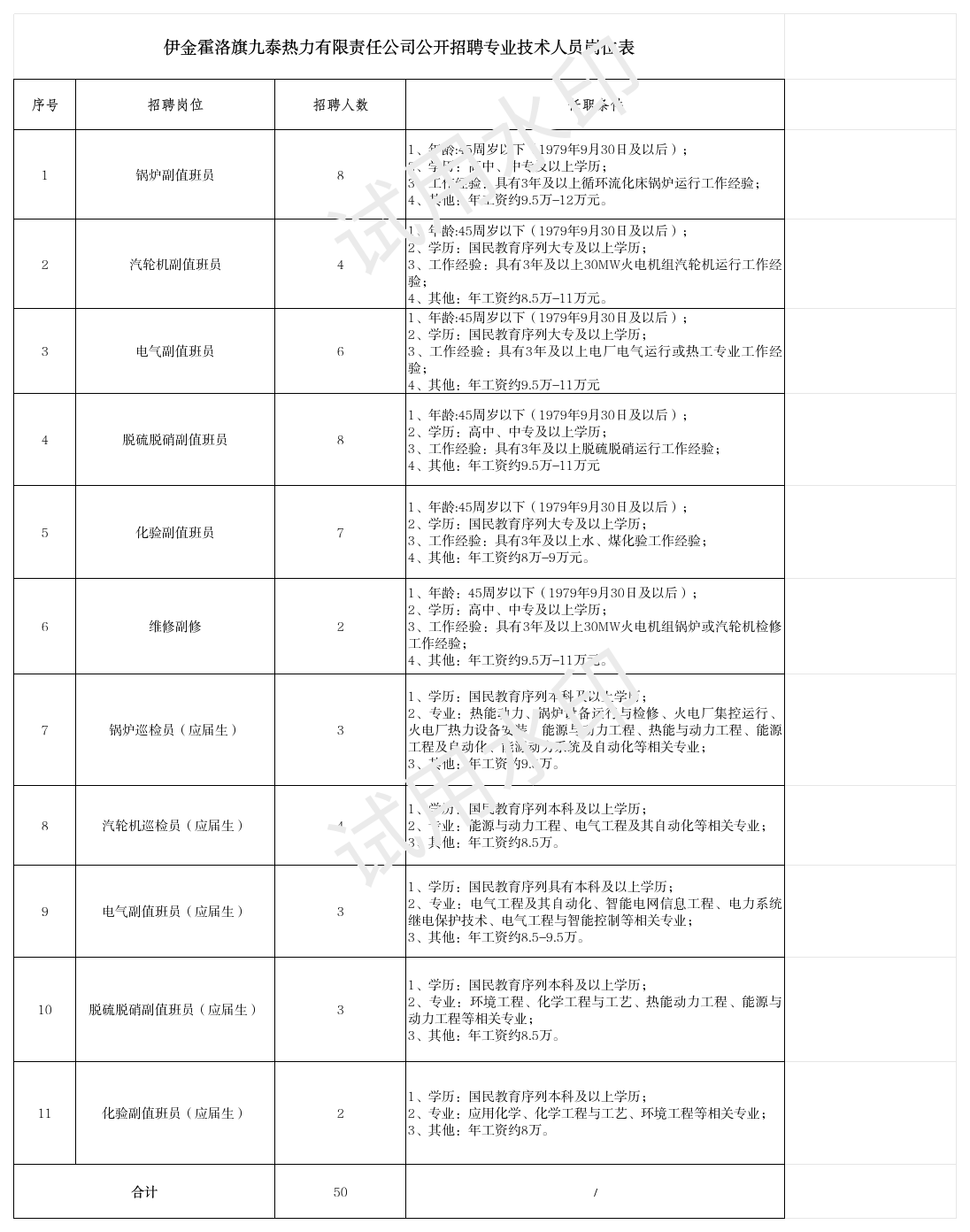 本次计划公开招聘专业技术人员50人,其中社招人员35人,应届高校毕业生15人,招聘岗位表详见附件1《伊金霍洛旗九泰热力有限责任公司公开招聘专业技术人员岗位表》,每位应聘人员限报考一个岗位。